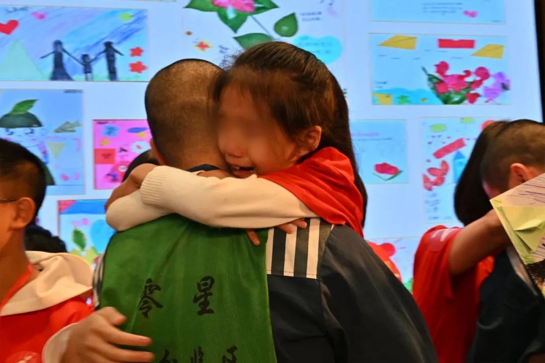 在“穿墙引线”亲情见面会的现场,几天来一直趴在妈妈肩膀上的晓爱自己站到了台上,精神满满,睁大着眼睛在台下的人群中找寻爸爸的身影。在亲情会见的环节,当爸爸飞奔上前时,晓爱紧紧地抱住了他,泪水顿时奔涌而出,仿佛要将这段时间的思念都释放出来。她把头搭在爸爸的肩膀上,深深地吸了一口气,那是她久违的、熟悉的爸爸的味道。